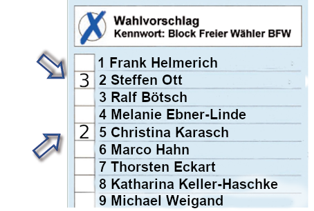 2. Verschenken Sie keine Stimme. Kreuzen Sie deshalb zuerst die Kopfleiste z. B. des Blocks Freier Wähler an (wie das blaue X)